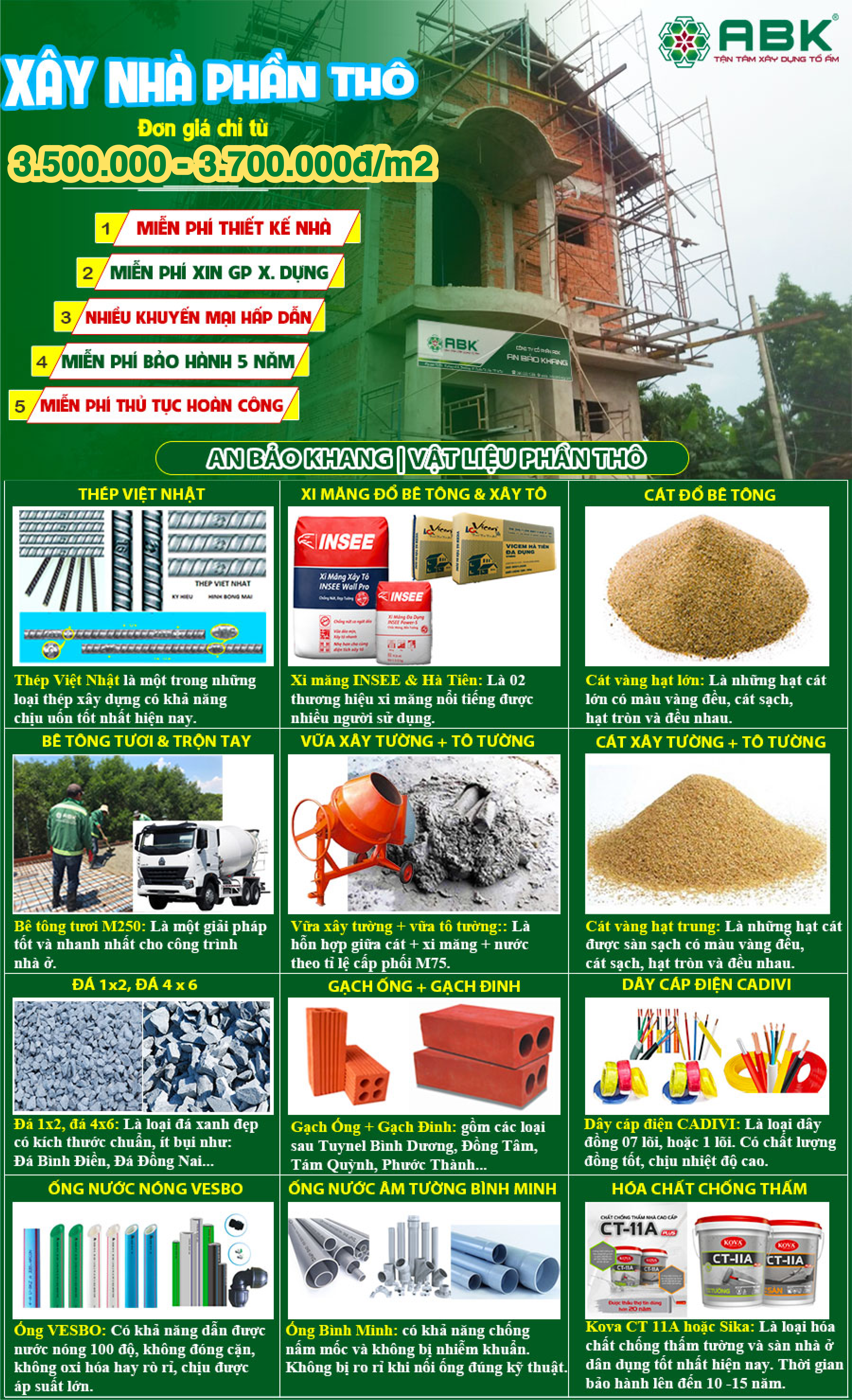 Để dự toán giá xây dựng nhà phần thô bao nhiêu tiền quý vị cần phải biết được tổng diện tích xây dựng theo mét vuông và nhân với đơn giá một mét vuông chúng ta sẽ được chi phí xây dựng phần thô của nhà mình. Hiện nay trên trang website: anbaokhang.com của công ty xây nhà chuyên nghiệp An Bảo Khang đã có ứng dụng tính chi phí xây dựng theo mét vuông được rất nhiều khách hàng sử dụng và có những đánh giá rất tích cực về sự chính xác, sự bổ ích từ ứng dụng này.