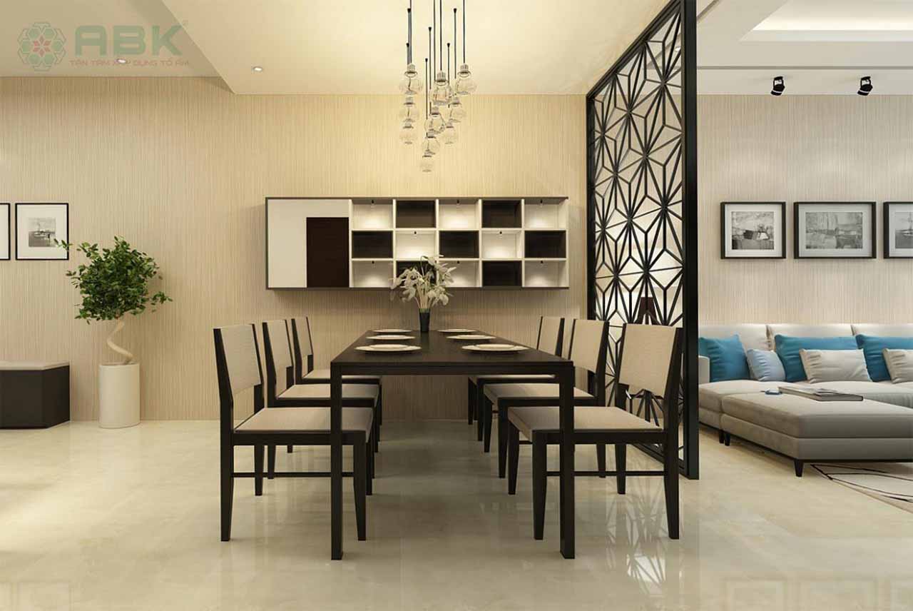 Với diện tích 75m2, phòng khách thường liền kề với phòng bếp cho nên có thể sử dụng vách ngăn có hoa văn độc đáo để ngăn cách hai không gian phòng. Điều này vừa không làm cho không gian trông hẹp hơn mà ngược lại còn tăng thêm tính thẩm mỹ cho không gian nhà.