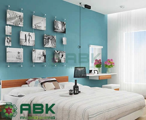 Phòng ngủ: Là nơi lý tưởng nhất mỗi khi về đến nhà giúp giải tỏa bao nhiêu mệt mỏi bên ngoài và bắt đầu ngày mới khỏe khoắn về thể chất thóa mái tinh thần, làm việc đạt hiệu quả cao. Cho nên màu thích hợp cho tường phòng ngủ là màu xanh ngọc,cùng với đó vài bức ảnh mang nhiều kỹ niệm vui mà chúng ta có thể ngắm nhìn trước khi ngủ ngon hằng ngày. Kết hợp vơi màu trắng ngà của chăn – ga – gối mang lại cảm giác bình yên, nhẹ nhàng và thỏa mái.