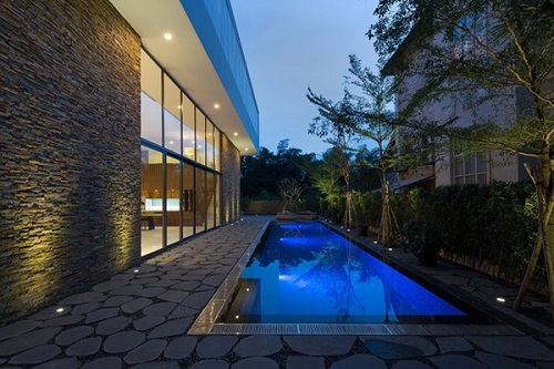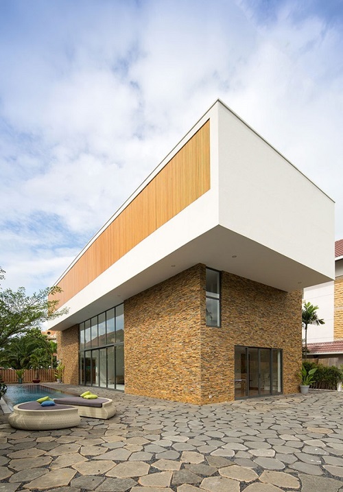 Sự kết hợp của các kiểu họa tiết lặp lại trên các loại vật liệu làm nổi bật hình khối sắc cạnh của hồ bơi và hai khối lớn của biệt thự.