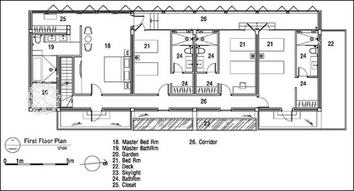 Cầu thang ở lối vào dẫn lên không gian phía trên nhà để xe với phòng ngủ, phòng tắm và khu vực nghiên cứu.