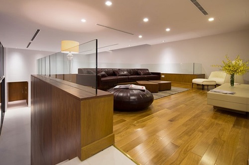 Phòng gia đình ấm cúng với gỗ lát sàn màu nâu vàng trầm.