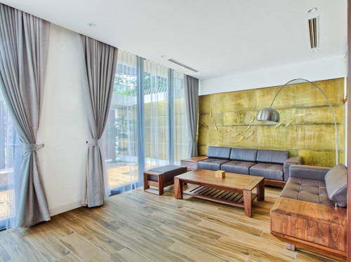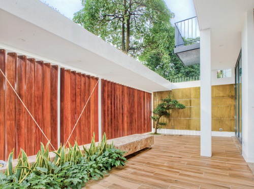 Không giống như những căn biệt thự khác được thiết kế gara ngay trong khuôn viên biệt thự, căn biệt thự này không có gara do gia chủ không thích có mùi xăng xe trong nhà. Vì thế cho nên để dành trọn diện tích cho sân vườn xanh mát, gia chủ sẽ gửi xe ở bên ngoài.