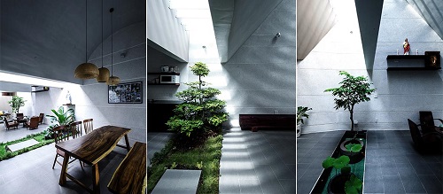 Do chiều sâu của căn nhà lớn nên KTS đã sử dụng các diện trần cong, gấp, vuốt chéo khác nhau nhằm tạo những cảm xúc khác biệt ở từng lớp không gian. Trong nhà không có nhiều cửa sổ, tuy vậy ngôi nhà vẫn vô cùng thoáng sáng nhờ những khoảng mái kín trên trần nhà.
