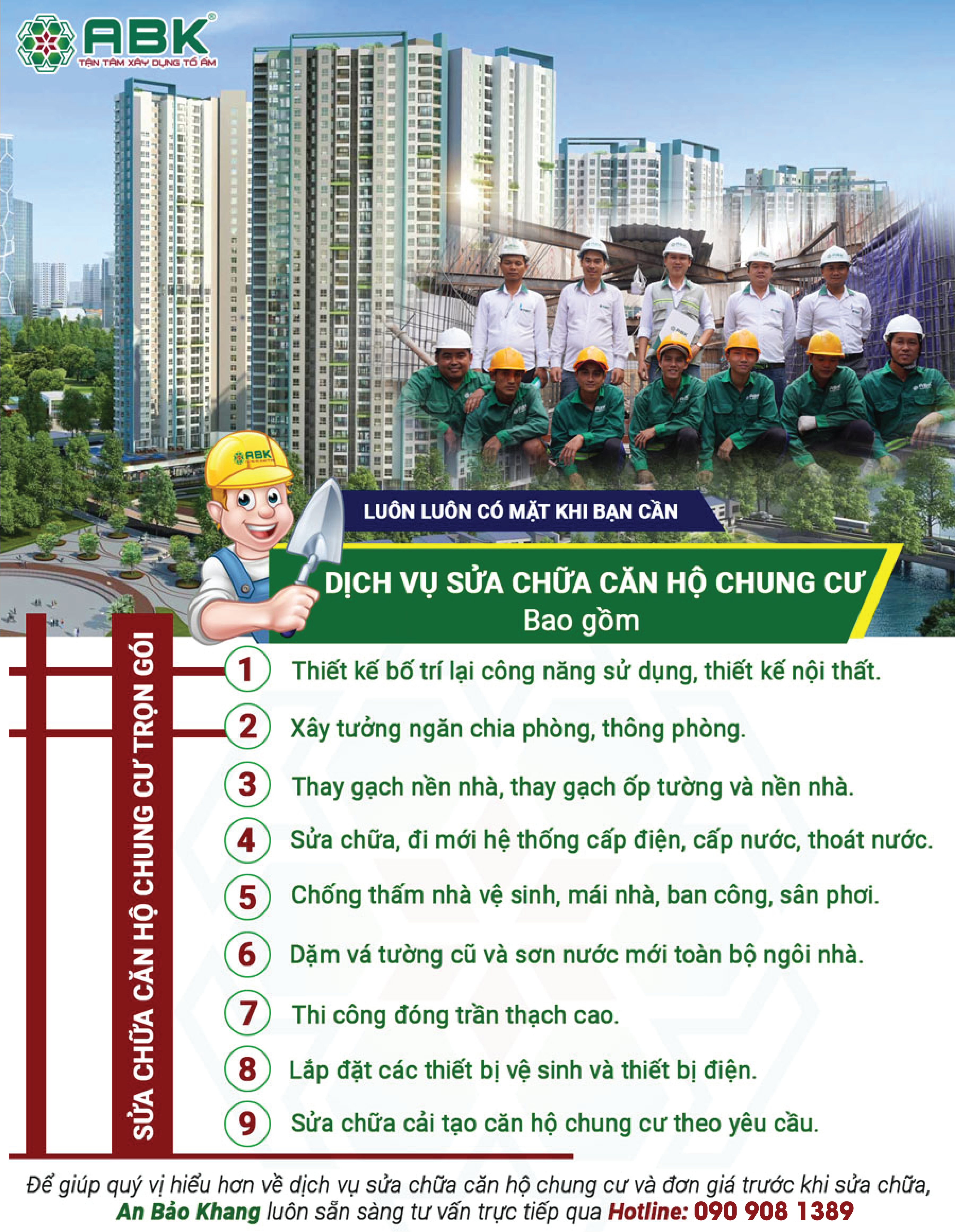 Với dịch vụ sửa nhà chung cư An Bảo Khang thi công các hạng mục như sau: