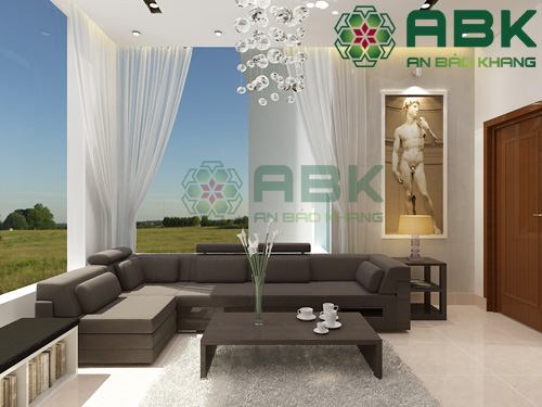 Một góc khác của phòng khách được bố trí nhiều nội thất cao cấp với tông màu trắng xám