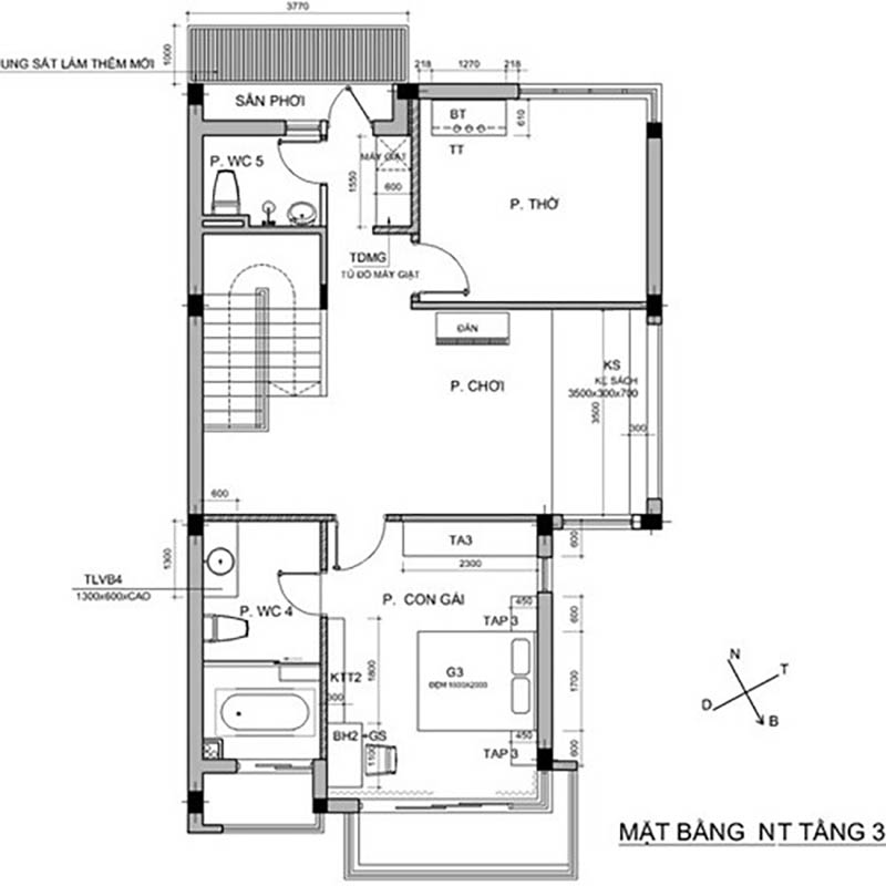 Tầng 3 bố trí một không gian phòng ngủ cho bé gái, phòng thờ, phòng thư giãn, phòng vệ sinh và sân phơi