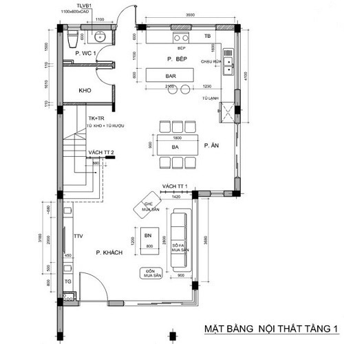 Mặt bằng tầng 1 được bố trí không gian phòng khách, phòng bếp, phòng ăn và phòng vệ sinh