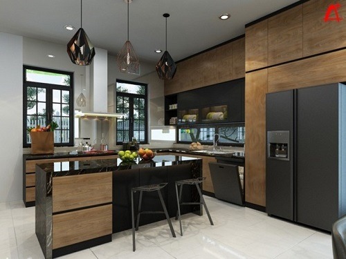 Cũng giống như phòng khách, phòng bếp sử dụng tông màu đậm cùng với thiết kế bàn bar độc đáo tạo nên sự sang trọng cho phòng bếp. Đặc biệt, điểm nhấn của phòng bếp nằm ở hệ thống đèn trang trí có thiết kế độc đáo ở phía trên