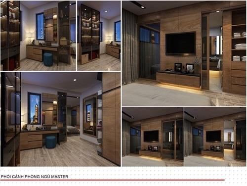 Phòng ngủ chính sử dụng nội thất chủ yếu bằng chất liệu gỗ, trang bị đầy đủ các món đồ nội thất cần thiết như bàn trang điểm tủ quần áo, tivi…