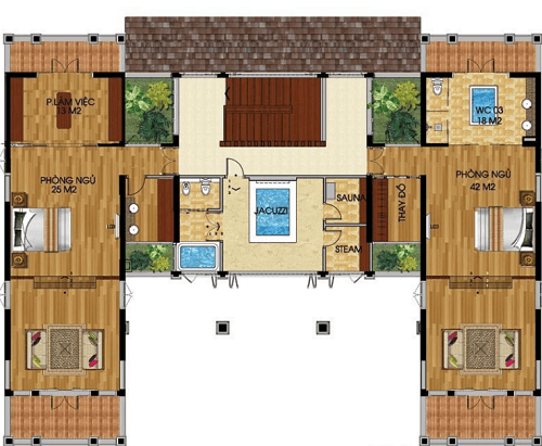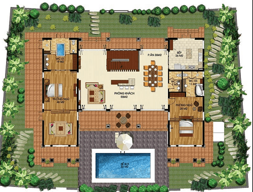 Điểm đặc biệt của mẫu thiết kế biệt thự này, chính là sử dụng kiểu mái thái truyền thống và xây dựng biệt thự theo lối chữ U..