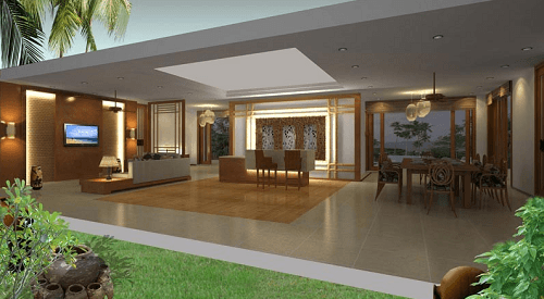 Phòng khách rộng rãi với không gian mở tạo nên sự thông thoáng với không gian bên ngoài. Nội thất phòng khách chủ yếu bằng chất liệu gỗ mang đến sự sang trọng và đẳng cấp