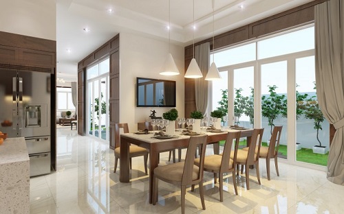 Phòng ăn với bàn ghế làm bằng chất liệu gỗ, kết hợp với vị trí gần cửa sổ mang đến sự thoáng đãng với view xanh mát từ cảnh bên ngoài