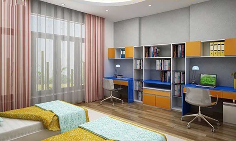Sử dụng gam màu xanh và trắng cùng với đồ nội thất hiện đại và bài trí hợp lý, đây là phòng ngủ dành cho 2 đứa trẻ trong gia đình
