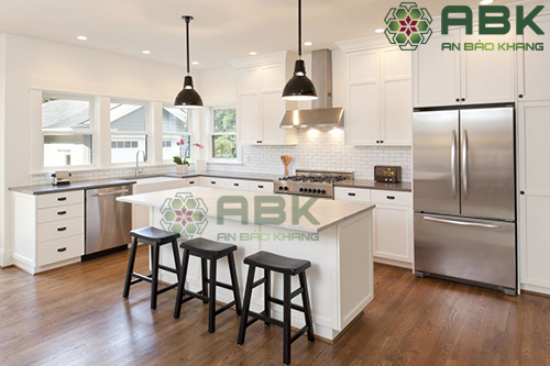 Phòng bếp được thiết kế theo tông màu trắng đen chủ đạo kết hợp với những cây đèn treo tạo điểm nhấn trẻ trung năng động.
