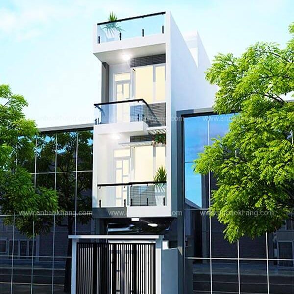 Với kiến trúc hiện đại, thiết kế đơn giản nhưng sang trọng. Kết hợp màu sơn trắng với gạch ốp màu đen tạo sự nổi bật cho ngôi nhà, cùng với lan can ban công là bằng bằng kinh cường lực thể hiện sự hiện đại, thời thượng của ngôi nhà và gia chủ.