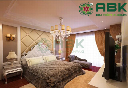 Phòng ngủ rất nổi bật với bộ ra giường và kèm hiện đại mang nét cổ điển