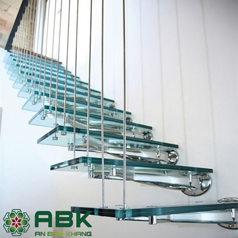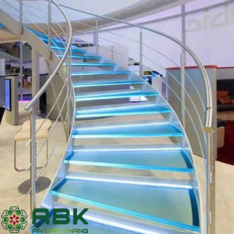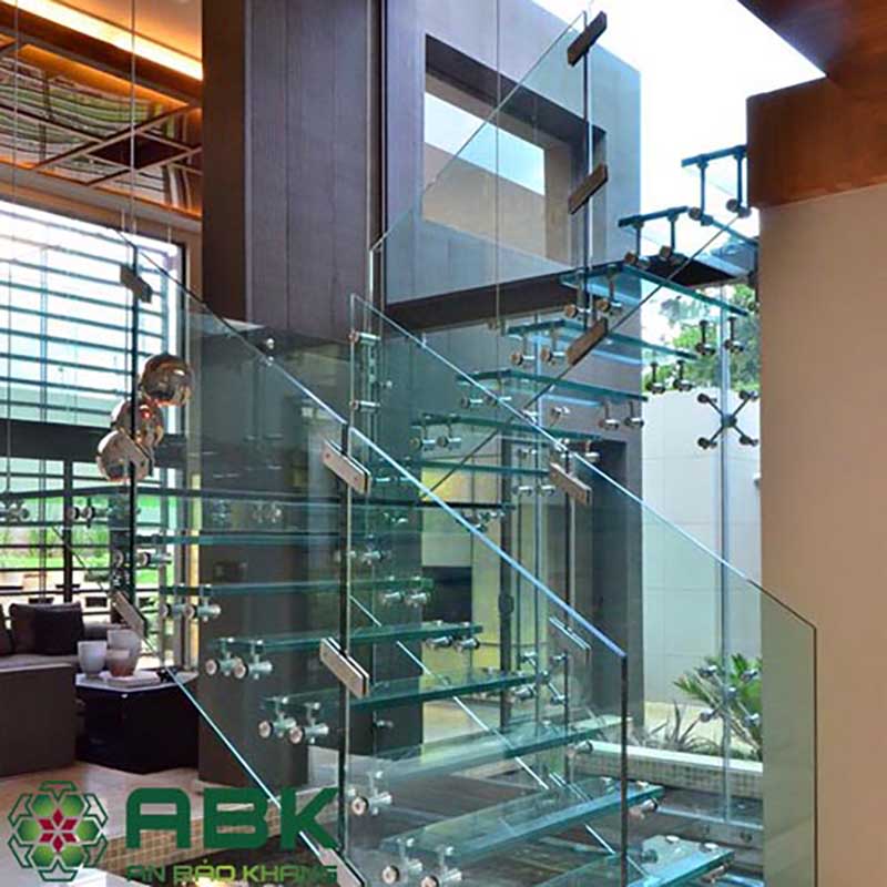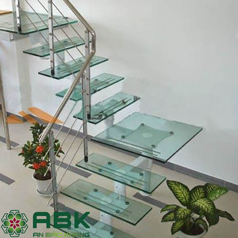 Cầu thang kính cường lực đổi hướng 90 độ, khung Inox cao cấp