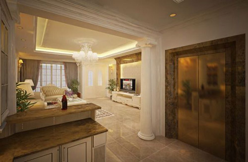 Bên trong căn nhà còn có thang máy được trang trí màu vàng tinh xảo