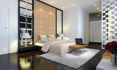 Phòng ngủ bài trí trên không gian tầng 2 sử dụng gam màu sáng, cùng với món đồ nội thất có thiết kế đơn giản tạo nên sự thông thoáng và rộng rãi cho cặp vợ chồng. Sử dụng thảm lát nền như một cách tạo điểm nhấn trong không gian nền lát gỗ ấm áp