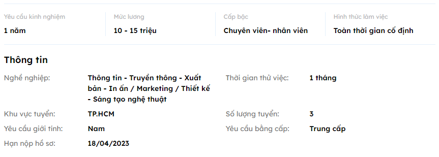 • Yêu cầu bằng cấp: Trung cấp, cao đẳng, đại học trở lên